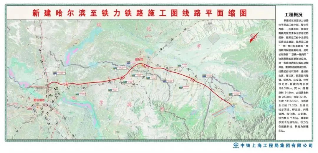 项目概况:哈伊高铁起自黑龙江省哈尔滨市,途经绥化市,终至伊春市,正线全长318公里,设计时速250公里,建设工期5年。哈伊高铁全线设哈尔滨、哈尔滨北、呼兰北、兴隆镇西、绥化南、庆安南、铁力、日月峡、伊春西9座车站。本次开工建设的哈尔滨至铁力段正线全长188公里,地处高寒地区,沿线地质结构复杂。
