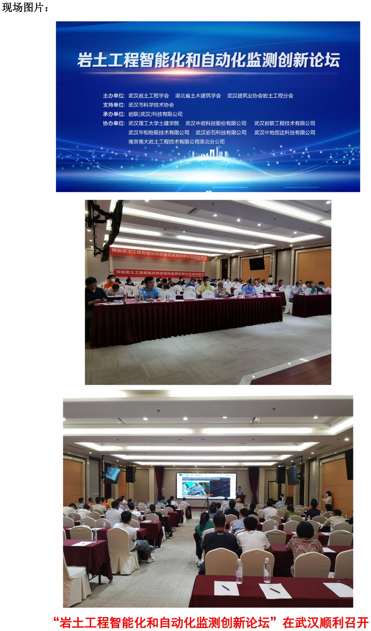 2022年9月28日下午,由武汉岩土工程学会、湖北省土木建筑学会、武汉建筑业协会岩土工程分会主办,武汉市科学技术协会支持,岩联(武汉)科技有限公司承办的“岩土工程智能化和自动化监测创新论坛”,在武汉中南路14号纽赛尔酒店顺利召开。会议的协办单位有:武汉理工大学土木工程与建筑学院,武汉中岩科技股份有限公司,武汉岩联工程技术有限公司,武汉岩石科技有限公司,武汉中地恒达科技有限公司,南京南大岩土工程技术有限公司湖北分公司,武汉华和物联技术有限公司。受疫情影响,本次大会采用线上和线下相结合的形式举行。