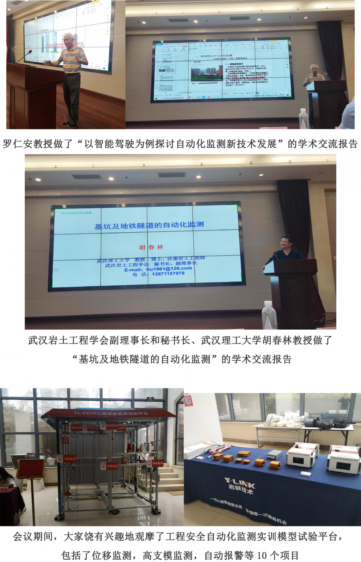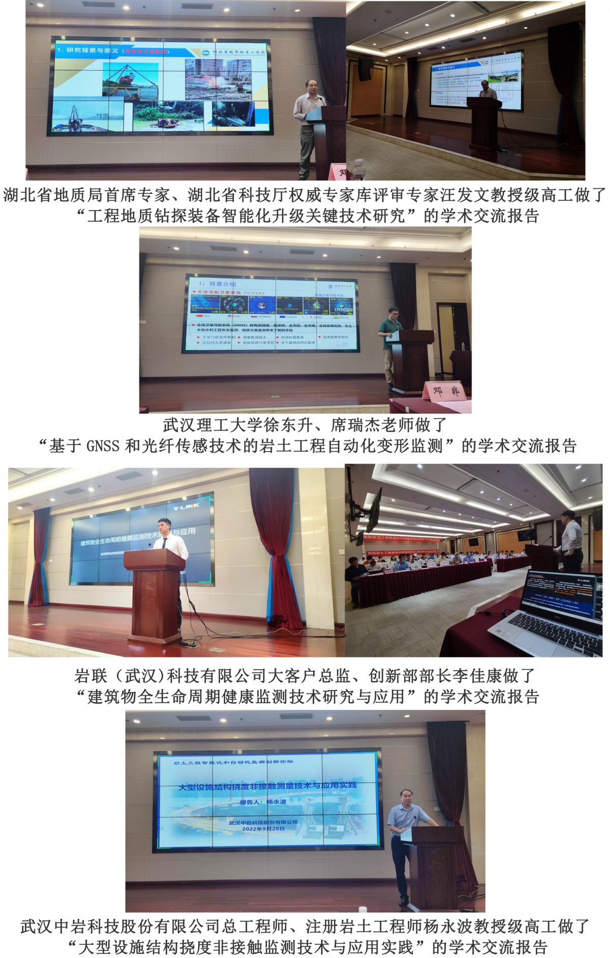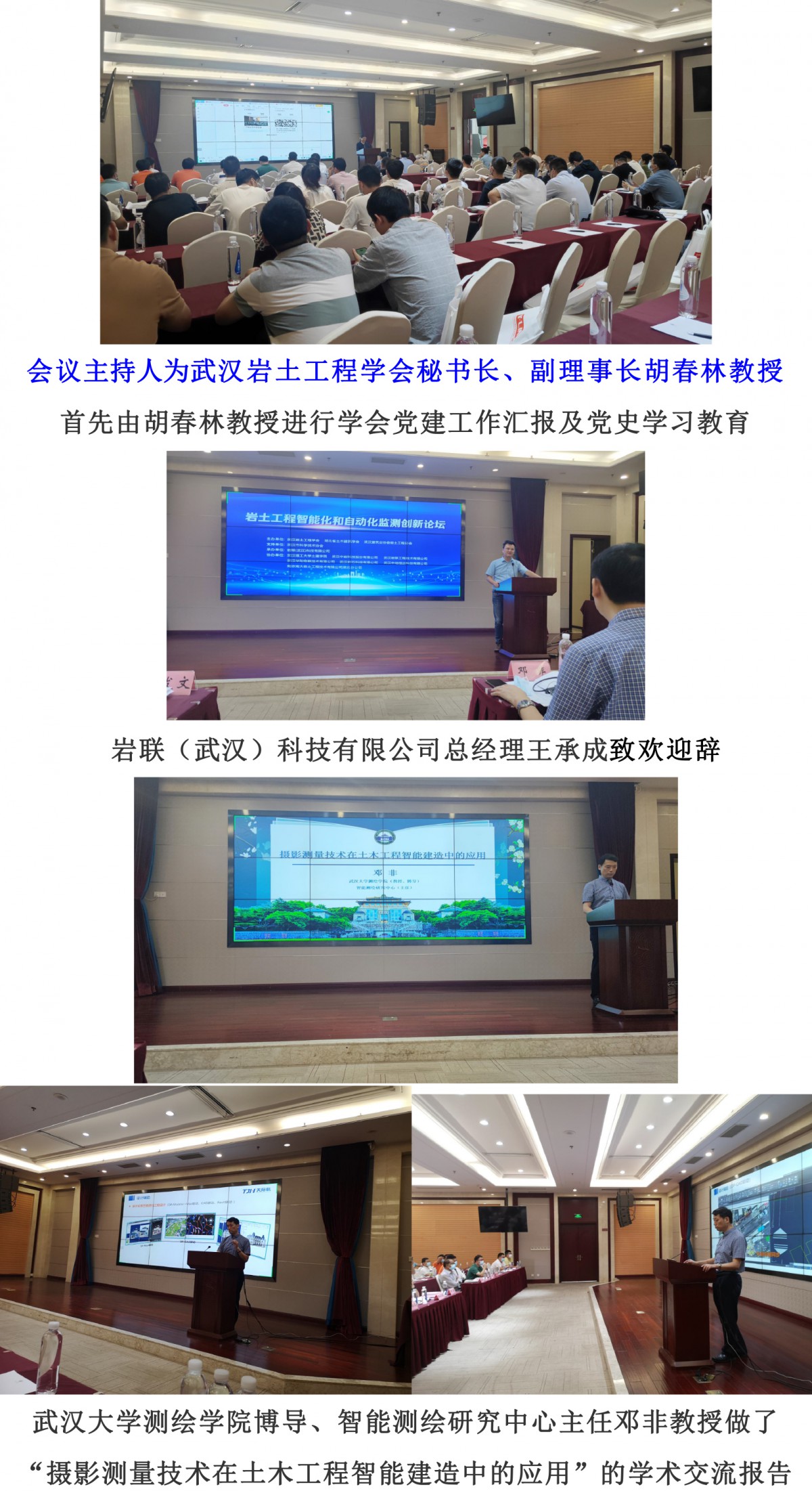 下午1点30分首先由胡春林教授进行学会党建工作汇报及党史学习教育。然后,会议主持人胡春林教授宣布大会开始,由岩联(武汉)科技有限公司总经理王承成致辞。之后接着,武汉大学博士生导师邓非教授做了“摄影测量技术在土木工程智能建造中的应用”的学术交流报告,报告介绍了多源摄影测量技术的最新进展,将卫星、无人机、地面巡检装备等多源数据联合处理、并行计算、多端协同以及机器学习AI方法,创新性地应用在智能化工程建造及监测中。通过低空无人机摄影照片和地面采集的近景影像,实现联合定向和自动生成高分辨率真三维模型,全面提升工程现场实景三维模型质量和精度。通过GIS+BIM+UAV图形融合,形成土木工程数字孪生底图,并接驳风险源状态、缺陷病害、监测数据等多源数据。以AI智能计算技术实现土石方量精确计量,非接触式手段对微小形变进行进行监测,实现建造过程中的远程在线智能化巡查、监测和检测;湖北省地质局首席专家、湖北省科技厅权威专家库评审专家汪发文教授级高工做了“工程地质钻探装备智能化升级关键技术研究”的学术交流报告,报告介绍了小型钻机钻进效率在线优化控制技术、小型钻机工况识别与安全智能预警技术、小型钻机智能化控制系统研究开发进展以及小型钻机在长江流域滑坡定点监测中的最新应用;武汉理工大学徐东升、席瑞杰老师做了“基于GNSS和光纤传感技术的岩土工程自动化变形监测”的学术交流报告,报告介绍了卫星导航定位技术和光纤传感技术在岩土工程自动化监测中的应用,介绍了光纤传感系统的自主研发历程和关键技术;岩联(武汉)科技有限公司大客户总监、创新部部长李佳康做了“建筑物全生命周期健康监测技术研究与应用”的学术交流报告,报告结合实际工程案例介绍了建筑物监测实训模型、建筑物施工过程监测技术及设备、建筑物运营期监测技术及设备、数据采集系统及数据处理云平台;武汉中岩科技股份有限公司总工程师、注册岩土工程师杨永波教授级高工做了“大型设施结构挠度非接触监测技术与应用实践”的学术交流报告,报告介绍了非接触监测关键技术的创新及典型应用案例;上海大学罗仁安教授做了“以智能驾驶为例探讨自动化监测新技术发展”的学术交流报告,报告以智能驾驶为引对国内智能监测技术展开了讨论,进一步提出了对建筑安全无人操作监测新技术的探讨与展望;武汉岩土工程学会副理事长和秘书长、武汉理工大学胡春林教授做了“基坑及地铁隧道的自动化监测”的学术交流报告,报告从设计及施工的角度探讨基坑及地铁隧道自动化监测的新技术,包括基坑工程安全监测常用的仪器类型及原理、基坑自动化监测方案、隧道变形自动监测的几种手段等。整个演讲内容丰富,由浅入深,图文并茂,密切联系工程实际,展示并介绍了最新的自动化监测设备及技术,进行了细致和深度的剖析。