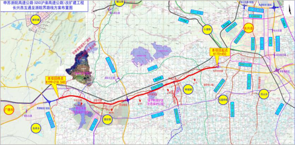 申苏浙皖高速公路改扩建工程长兴西互通至浙皖界项目改扩建起点位于湖州市长兴县画溪街道水角村附近,既有申苏浙皖高速长兴西互通,起点桩号K170+450(采用老路运营桩号),路线自东向西,经林城镇北部设有林城互通连接鼎兴中路(双车道,城市次干路),并于林城镇西部阳光村附近设有长兴服务区,路线继续向西,经泗安镇东北侧与S14杭长高速十字交叉设有泗安枢纽,路线沿泗安镇区北侧行进,于五里亭村附近下穿三界线(二级公路),经泗安镇区西北侧设有泗安互通连接泗安镇区和G235、G318,经泗安水库北侧高瓜塘村附近下穿G318,经G318西侧新增设置长合互通连接G318,沟通长三角(湖州)产业合作区,终点位于安徽省广德市桃州镇界牌村、浙江省湖州市长兴县泗安镇石头冲村附近,即申苏浙皖高速公路两省管养及收费里程分界处,终点桩号K199+218.540,顺接申苏浙皖高速公路改扩建工程安徽段线位,路线含断链1处,短链7.485m。路线全长约28.761km。