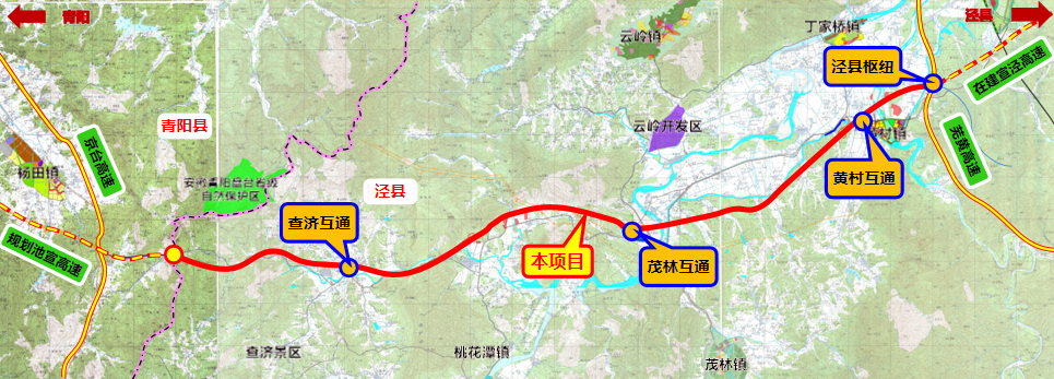 项目规模:宣城至东至高速公路泾县至青阳界段起点位于芜黄高速与在建宣泾高速交叉处,经黄村镇、沙元村、合溪村、厚岸村、进入青阳县后终于 G3 京台高速,路线全长约 43.05km,本项目实施终点位于泾县与青阳县界处,实施里程约39.24km。全线采用双向四车道高速公路标准,设计速度100km/h,路基宽度26米,沥青混凝土路面;投资估算586151.5483万元。