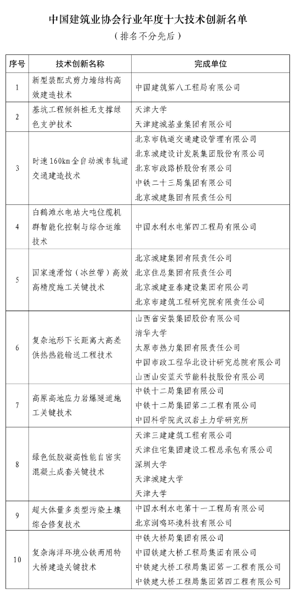 经有关协会、业内各领域专家和会员企业推荐,共同遴选,产生了中国建筑业协会行业年度十大技术创新项目,现予以公布。
