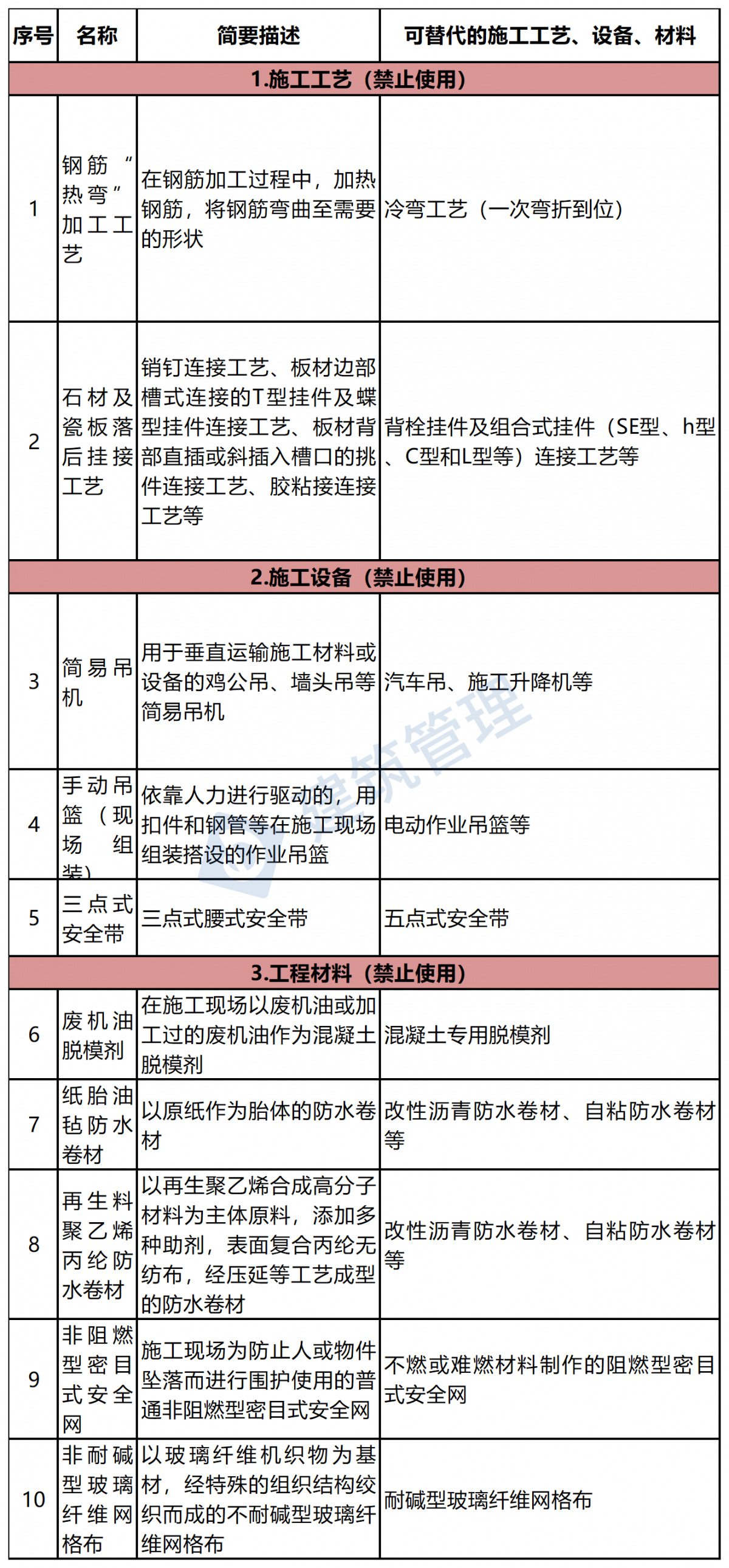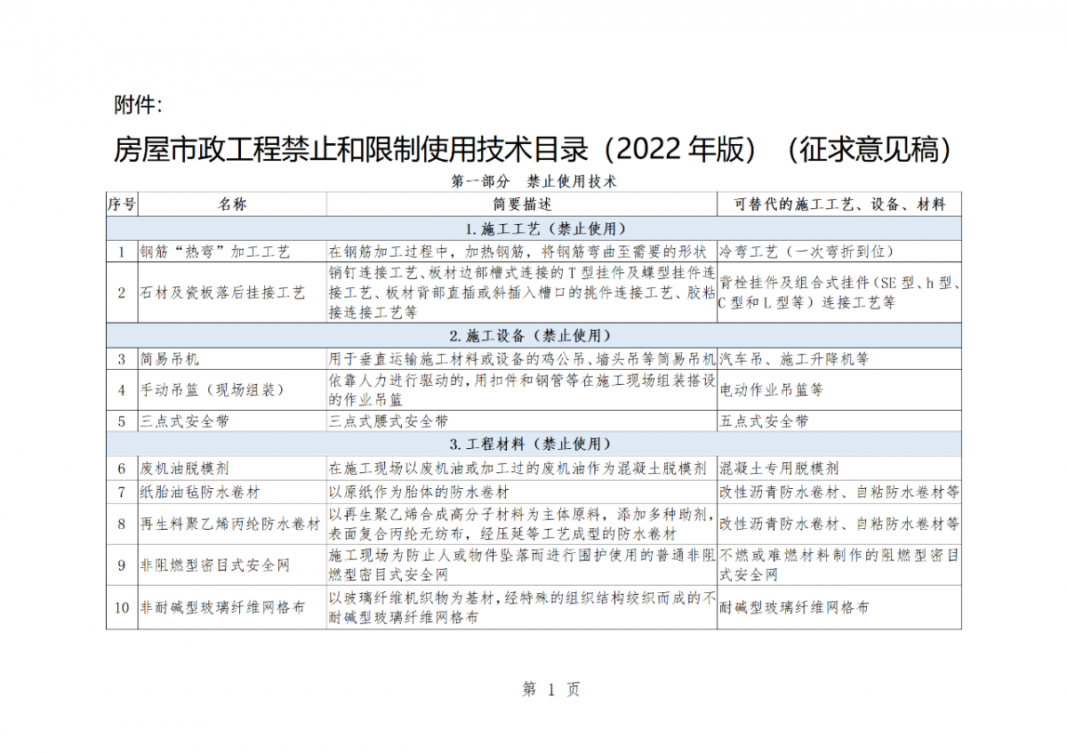刚刚,住建部官网发布《关于《房屋市政工程禁止和限制使用技术目录(2022年版)(征求意见稿)》公开征求意见的通知》,简易吊机、钢筋“热弯”加工工艺、三点式安全带等10项技术拟被禁止使用。轮扣式脚手架、支撑架、扣件式钢管卸料平台、钢管扣件型附着式升降脚手架等16项技术拟被限制使用。