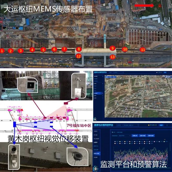 大运枢纽和黄木岗枢纽分别由深圳地铁3号线大运站和深圳地铁7号线黄木岗站扩建而成,枢纽新建基坑面积广、深度大,与既有运营车站间距近,变形控制难度极大。陈院士团队根据枢纽地层和周围结构物特点,建立三维精细化模型,分析了紧邻深大基坑施工过程中既有地上、地下车站结构和桩基的受力变形特征,提出了有针对性的变形控制措施。采用MEMS传感器、自动化全站仪、视觉位移等技术,对基坑和既有车站变形进行智能感知;研发了变形预测预警平台,采用5种人工智能算法嵌入平台,对结构变形进行预测预警,保障了开挖全过程基坑和既有车站结构安全。