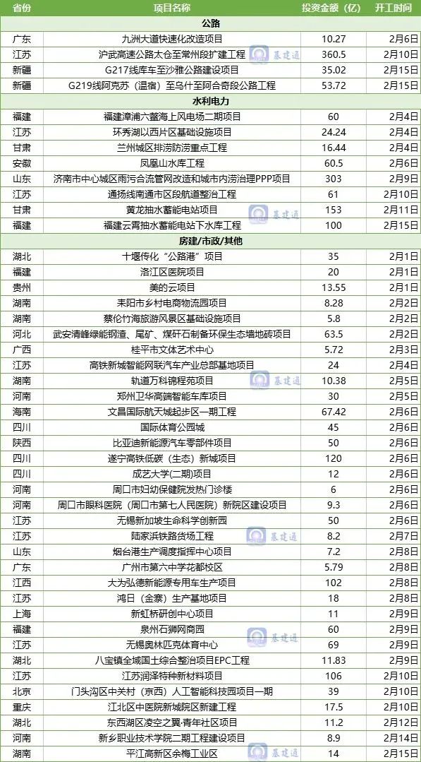 据统计:2月上旬(2月1日-2月15日),全国基建大项目约 45 个开工,总投资约 2303 亿元,涉及20个省市,具体开工项目如下: