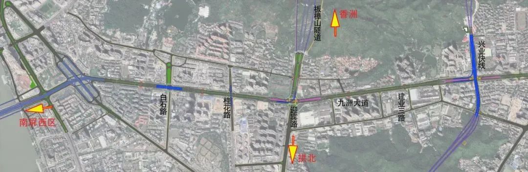 项目概况:项目西起前山立交,东至白莲路,全长约3.8千米,主要包括五大节点。其中,白石路节点计划建设九洲大道双向六车道桥梁上跨白石路,双向四车道辅路与白石路平交;桂花路节点计划建设桂花北路双向两车道桥梁上跨九洲大道,并排设置一座人行过街天桥;迎宾路节点计划建设西往北定向匝道,预留迎宾路南北向跨线桥建设条件;建业三路节点取消现状信号灯控制平交路口,封闭中分带,建设人行过街天桥;兴业快线节点计划建设兴业快线双向六车道桥梁上跨九洲大道,九洲大道双向四车道下穿隧道,同时设置西、北一对定向匝道。项目计划分节点逐个推进,预计2025年下半年完成全部节点改造。
