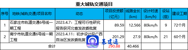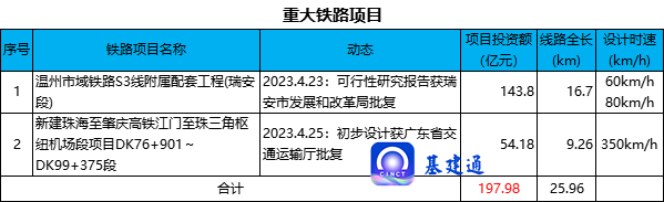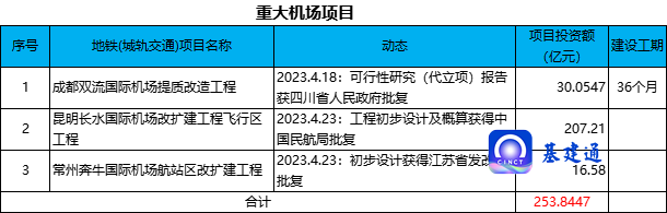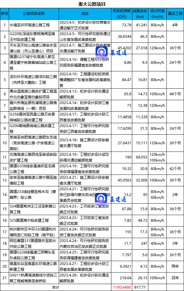 据统计,2023 年 4 月份,累计约有 28 项 5 亿元投资额以上的重大铁路、公路、城轨交通、机场项目可行性研究报告、初步设计、施工图设计等获得交通运输部、省级发改委/交通厅/人民政府、市级发改局、中国民航局等批复,项目总投资额约 1933 亿元。其中,铁路项目约 198 亿元,公路项目约 1190 亿元,城轨交通项目 291 亿元,机场项目约 254 亿元。项目批复汇总情况如下: