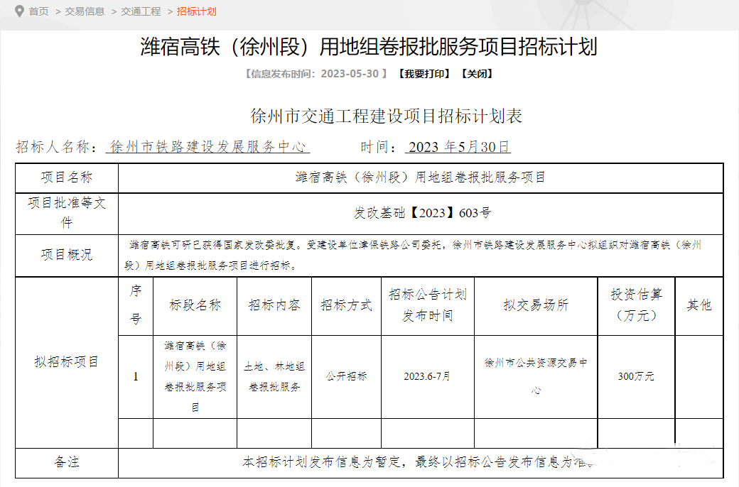 根据公示,潍宿高铁可研已获得国家发改委批复(发改基础【2023】603号)。受建设单位津保铁路公司委托,徐州市铁路建设发展服务中心、宿迁市铁路事业发展中心拟组织对潍宿高铁(徐州段、宿迁段)土地、林地组卷报批服务项目进行招标。