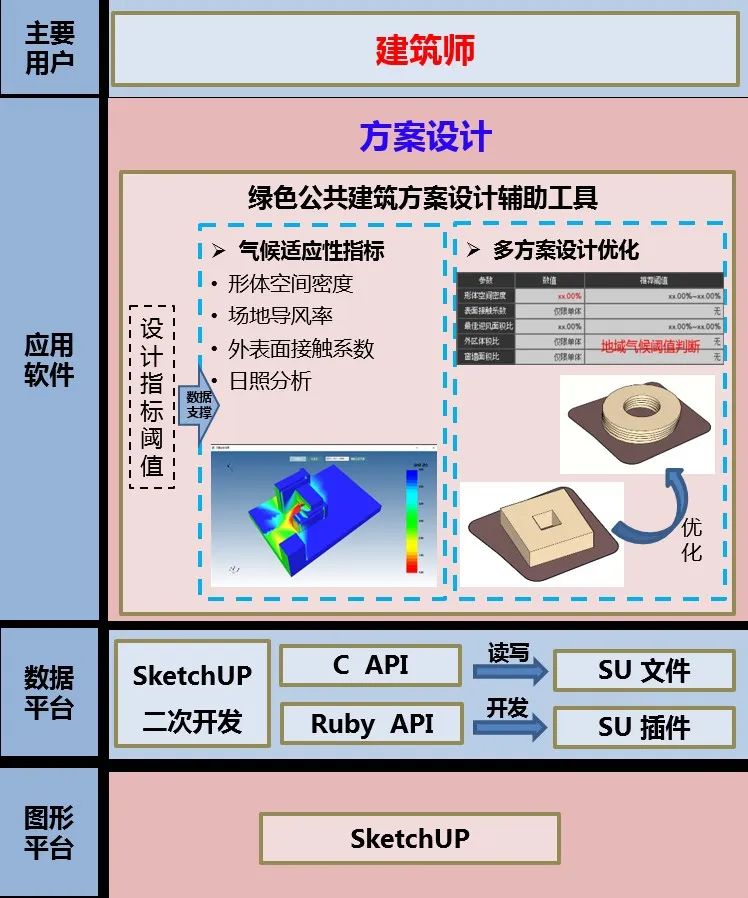本项目提出基于地域气候适宜理念的绿色公共建筑关键设计参数阈值;研发基于Sketchup平台的绿色公共建筑方案设计辅助工具,实现建筑方案气候适应型指标的快速对比和设计优化;研发国产化自主可控的绿色公共建筑深化设计辅助工具。