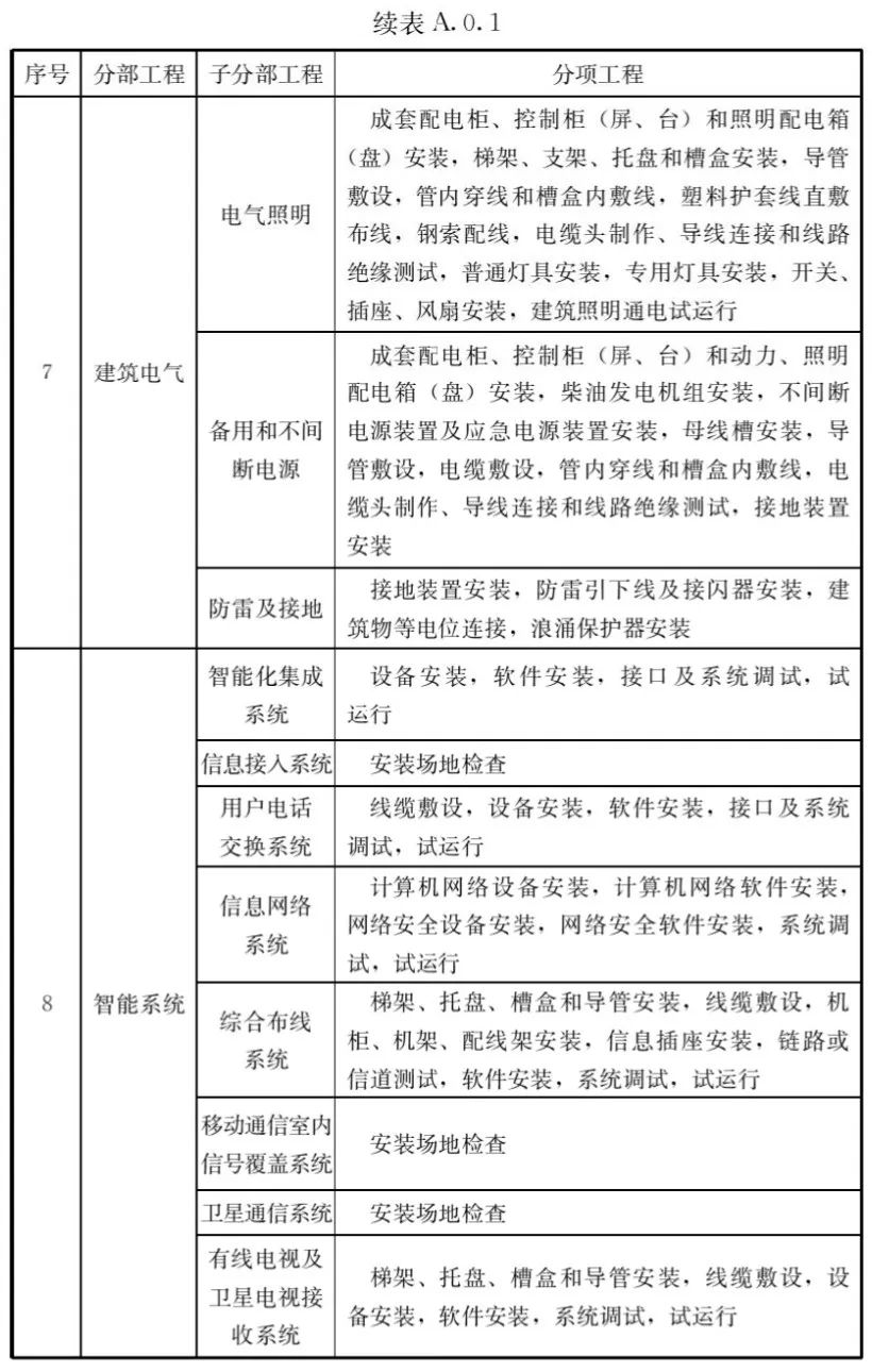 A.0.1建筑工程的分部工程、分项工程划分应符合表A.0.1的规定。