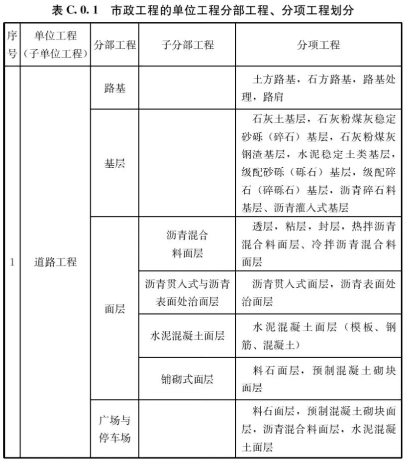 C.0.1市政工程的单位工程、分部工程、分项工程划分应符合表C.0.1的规定。
