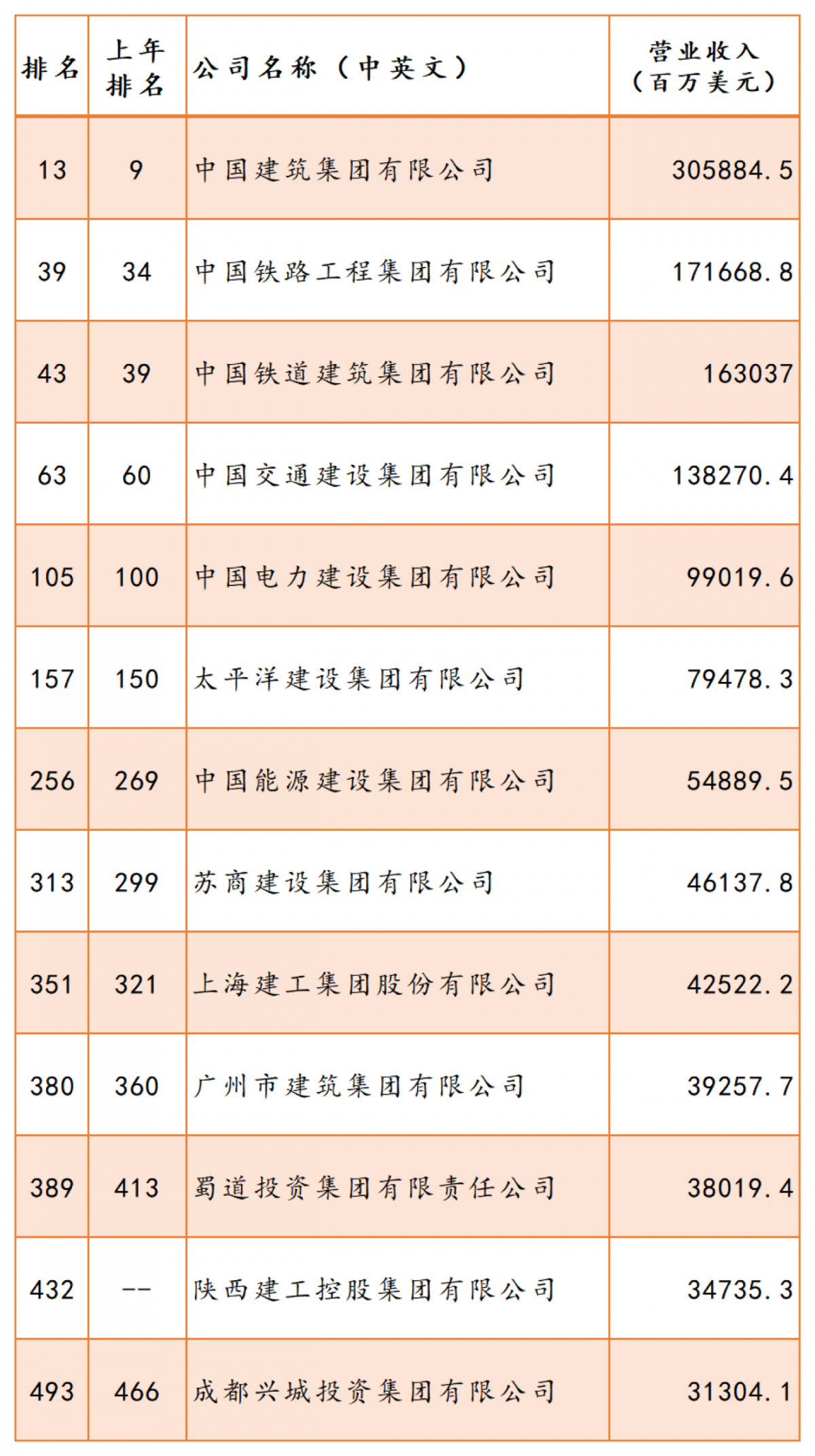 聚焦建设领域,工程与建筑类上榜中国企业为13家,相较去年上榜总数增加1家。值得一提的是,今年陕西建工控股集团有限公司以347亿美元的营业收入首次荣登世界500强,排名第432位。