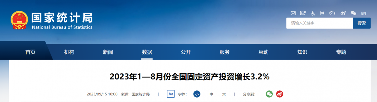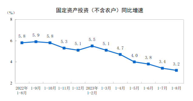 9月15日,国家统计局发布数据显示,1—8月份,全国固定资产投资(不含农户)327042亿元,同比增长3.2%,其中,制造业投资增长5.9%,增速比1—7月份加快0.2个百分点。从环比看,8月份固定资产投资(不含农户)增长0.26%。1—8月份,民间固定资产投资169479亿元,同比下降0.7%。