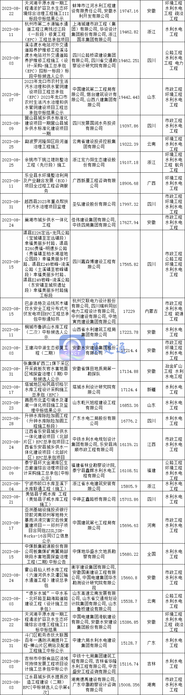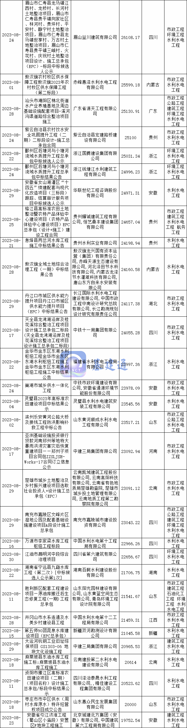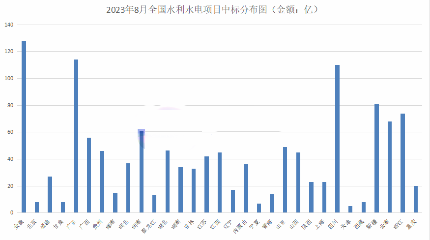 据统计,2023年8月全国水利水电项目中标额达到1321亿,项目数量达到2.4万个,与前几个月相比有所缩减。其中安徽、广东、四川、新疆、浙江等省中标额排前五。