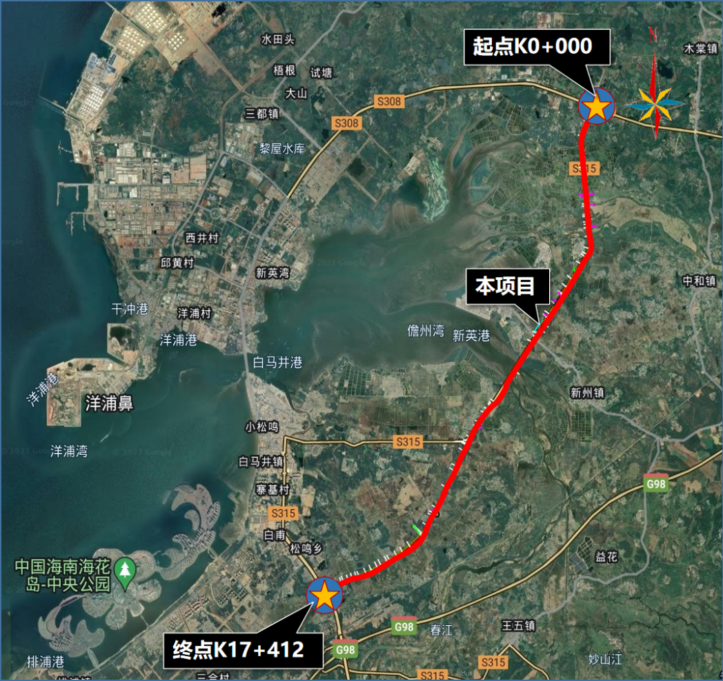 项目概况:项目起点位于儋州市木棠镇南侧,与省道S308美洋线交叉,终点位于白马井互通北侧,与洋浦大桥南连接线相接,途经木棠、中和、新州及白马井4个镇,路线总长17.412公里,全线共设置桥梁5座,采用双向四车道一级公路标准建设,设计车速为80公里/小时。建设工期为30个月。