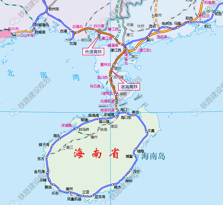 全线共新建3座车站:雷州北、龙门西、北港轮渡站,预留徐闻北站,引入既有湛江北、湛江西和海口站。