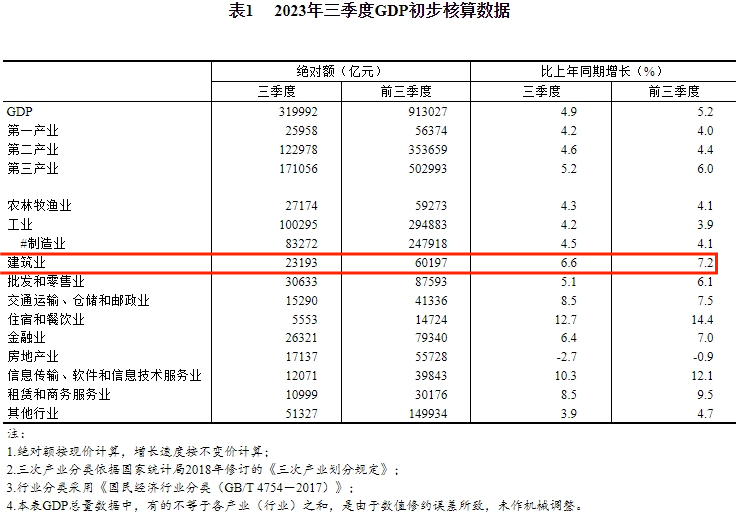 10月18日,国家统计局发布2023年三季度国民经济相关数据。初步核算,前三季度国内生产总值913027亿元,按不变价格计算,同比增长5.2%。建筑业第三季度总产值23193亿元,前三季度60197亿元。