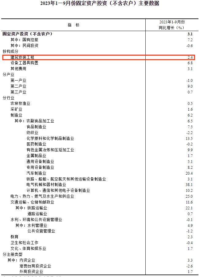 由上图所示,建筑业第三季度生产总值23193亿元,比上年同期增长6.6%;前三季度60197亿元,比上年同期增长6.6%。固定资产投资规模继续扩大,高技术产业投资持续较快增长前三季度,全国固定资产投资(不含农户)375035亿元,同比增长3.1%;扣除价格因素影响,同比增长6.0%。