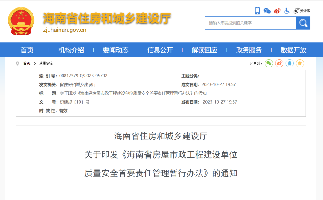 10月27日,海南省住建厅正式印发《海南省房屋市政工程建设单位质量安全首要责任管理暂行办法》,本办法自2023年12月1日起施行,有效期3年。