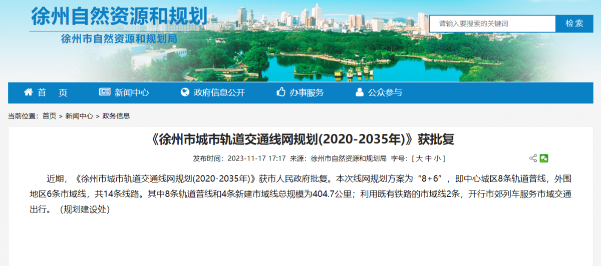 ●2023年11月,官网宣布,《徐州市城市轨道交通线网规划(2020-2035年)》获市人民政府批复。