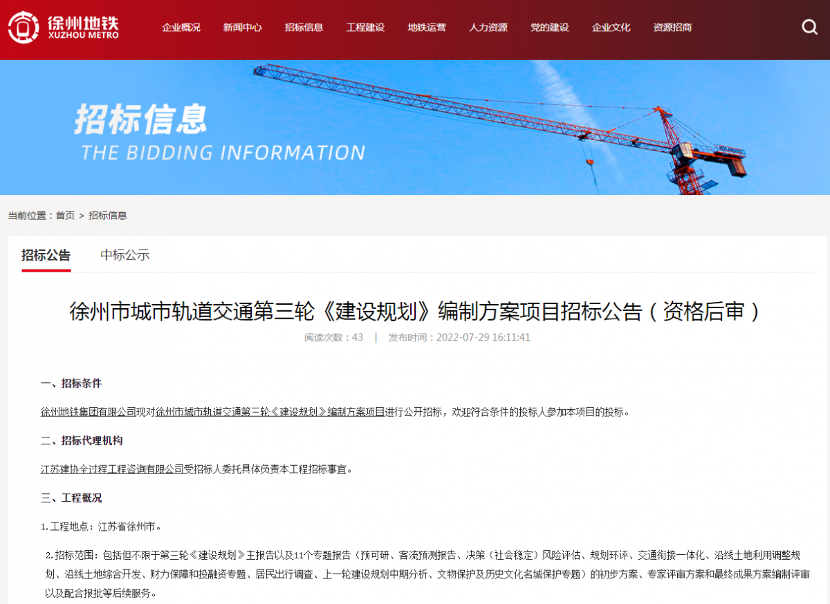 ●2022年7月29日,徐州地铁官网发布了徐州城市轨道交通第3轮《建设规划》编制方案招标公告!该项目的招标,标志着徐州地铁第3轮建设规划开始提上日程,正式进入流程。