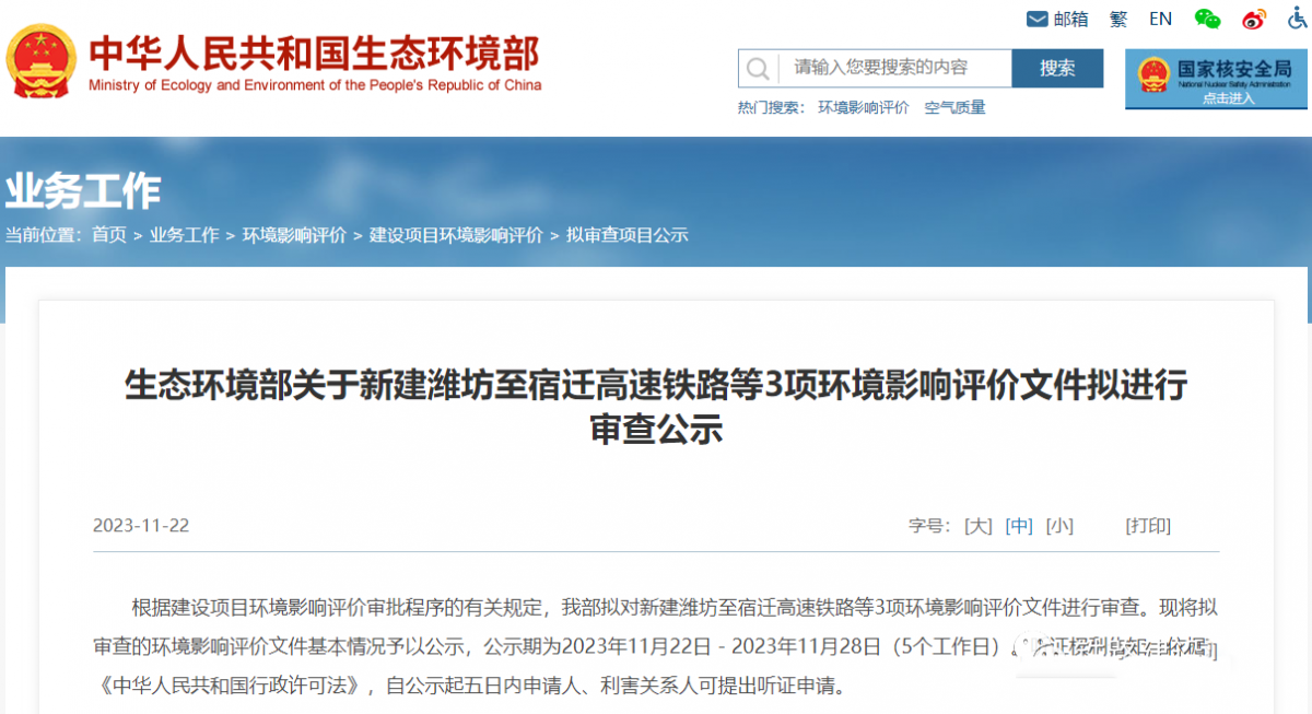 11月22日,生态环境部发布了《关于新建潍坊至宿迁高速铁路等3项环境影响评价文件拟进行审查公示》,即将对新建潍坊至宿迁高速铁路(含青岛连接线)及新建合肥至武汉高速铁路的环境影响评价文件进行审查。