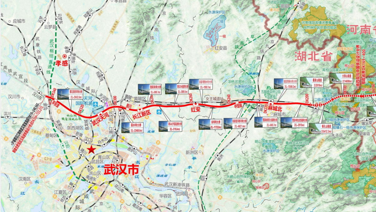 武汉枢纽、麻城地区相关及配套工程包括:新沟东南联络线、预留天河三四线工程、新建横店东联络线、麻城地区预留阜九高铁引入同步实施工程(中馆驿线路所)、红安地区改建既有武麻线工程。