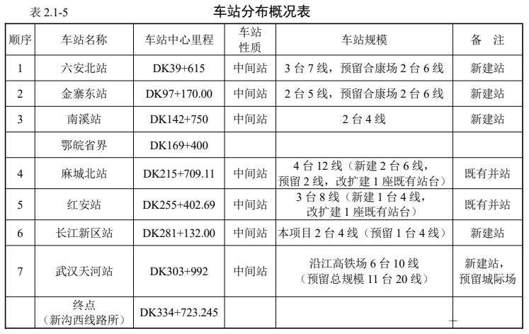 全线共设车站7座:六安北、金寨东、南溪、麻城北(并既有站)、红安(并既有站)、长江新区、武汉天河。