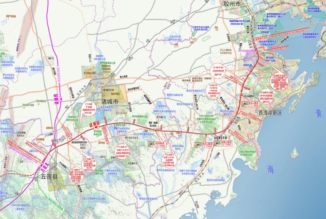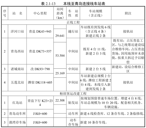 另含青岛枢纽、五莲北站相关工程,其中青岛枢纽工程包括红岛站4台8线工程、红岛新建客车技术整备所及客机折返段、青岛动车所改建工程;在五莲北站同步实施鲁中左右线工程。
