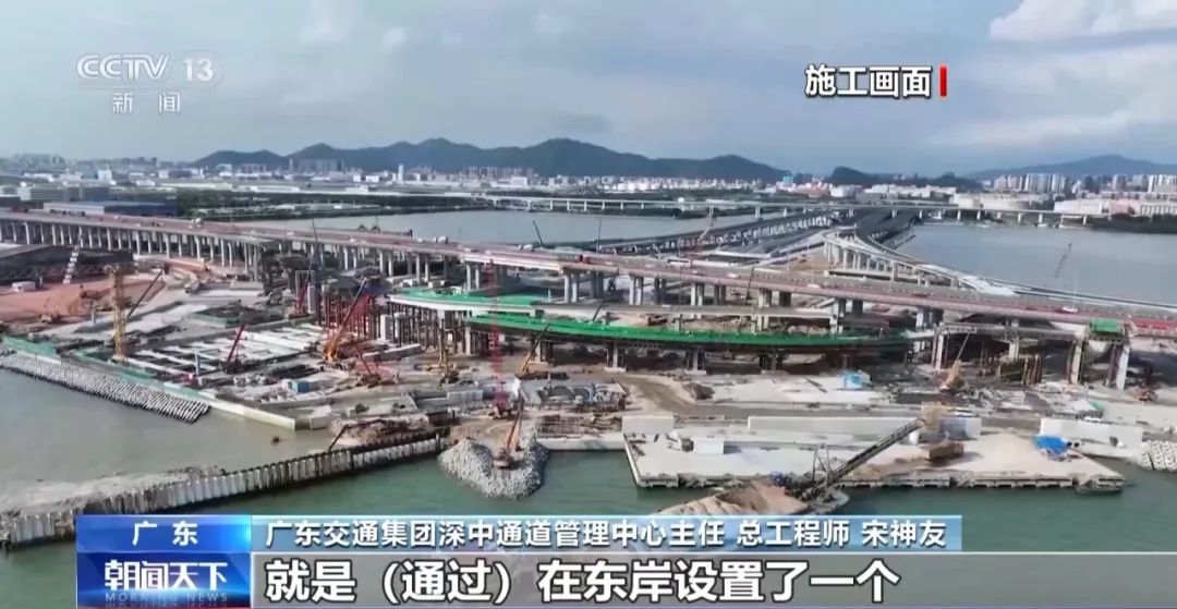 广东交通集团深中通道管理中心主任 总工程师 宋神友:未来,珠江西岸的人跟深圳机场以及前海实现快速交通转换,就是通过在东岸设置了一个高速公路在水下枢纽互通立交的形式,所以最终深中通道就是采用了桥岛隧水下枢纽互通于一体的跨海集群工程。