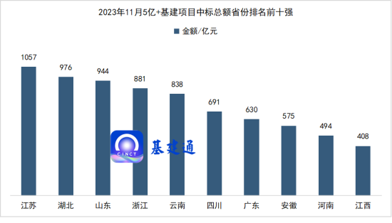 经统计,11 月份发榜的 5 亿+大项目在全国各省市自治区即海外地区均有分布,其中有 24 个地区工程中标额超过 100 亿元,而超千亿元的省份有 1 个。省份工程中标总额排名榜居前十强的地区有:江苏省、湖北省、山东省、浙江省、云南省、四川省、广东省、安徽省、河南省和江西省。