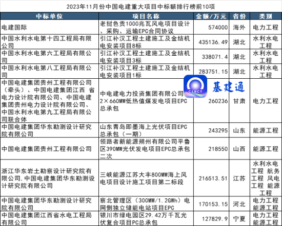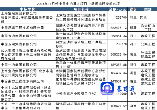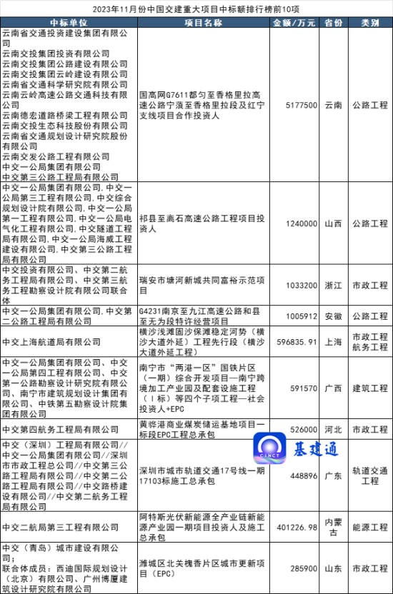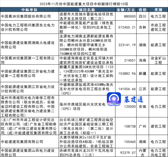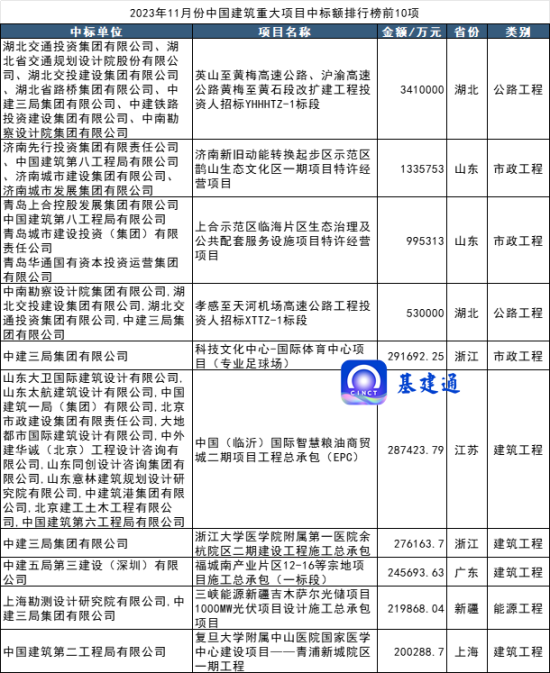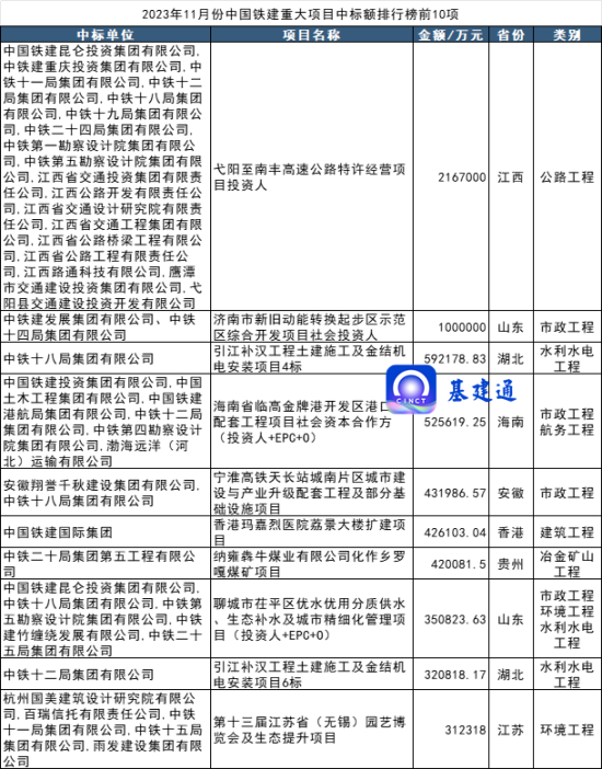 根据统计:11月份基建市场单个项目/标段金额超过 10 亿的约264 个,超过 50 亿的约32 个,其中 100 亿+项目约16 个。按单笔中标金额排名,月度前 30 个项目/标段中标榜单如下: