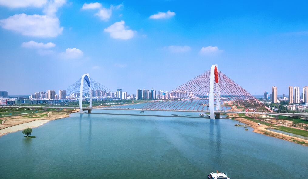 大桥设计方案确定为蚌埠之门,桥塔造型细节采用门形与蚌形的交融设计,索塔顶部造型中的曲线形态来自蚌壳上的纹路,类似贝壳的形态层叠出现,增强了景观设计的层次,丰富了索塔的审美体验,本桥具有强烈的形体表现,承载着城市文化底蕴、社会风貌和历史情怀,极具代表意义。桥塔亦可具象为通往蚌埠的一扇大门,穿过大门,将迈向新世纪,迈向崭新未来。