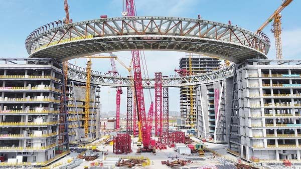 核心提示:日前,上海临港新片区城市地标、滴水湖金融湾核心标志——“荣耀之环”项目现场塔吊林立,建设一派繁忙。“荣耀之环”以四栋塔楼萦绕托举,外径153米,内径115米,圆环宽度约为16米,支座之间最大跨度120米,层高6.6米,用钢量约1.1万吨。