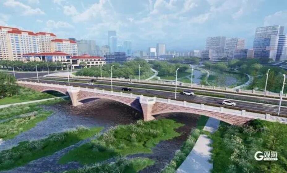 新南路桥梁设计为三跨连续拱桥,长104米,跨径布置为32米+40米+32米,车行道双向六车道,桥区内加设护栏及设置人行道观景平台,总宽为36-43.6米。