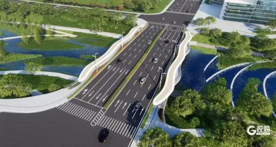 其中,科苑经七路桥梁设计为三跨钢结构独塔斜拉桥,门字形桥塔,长285米,跨径布置为50米+120米+115米,车行道双向八车道,桥区因加设护栏及绿道系统连接辅桥设置,总宽为42-61米。