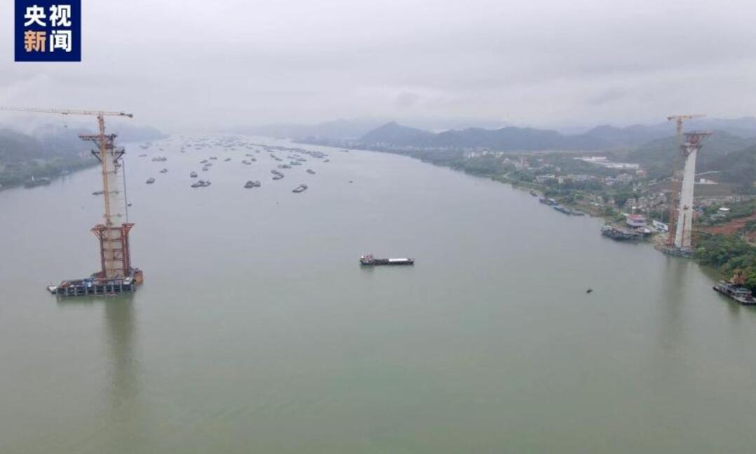 7月28日,在广西苍容浔江大桥施工现场,牵引船拽拉着先导索,从中塔分别牵引至南北边塔,三座主塔首次实现“牵手”。