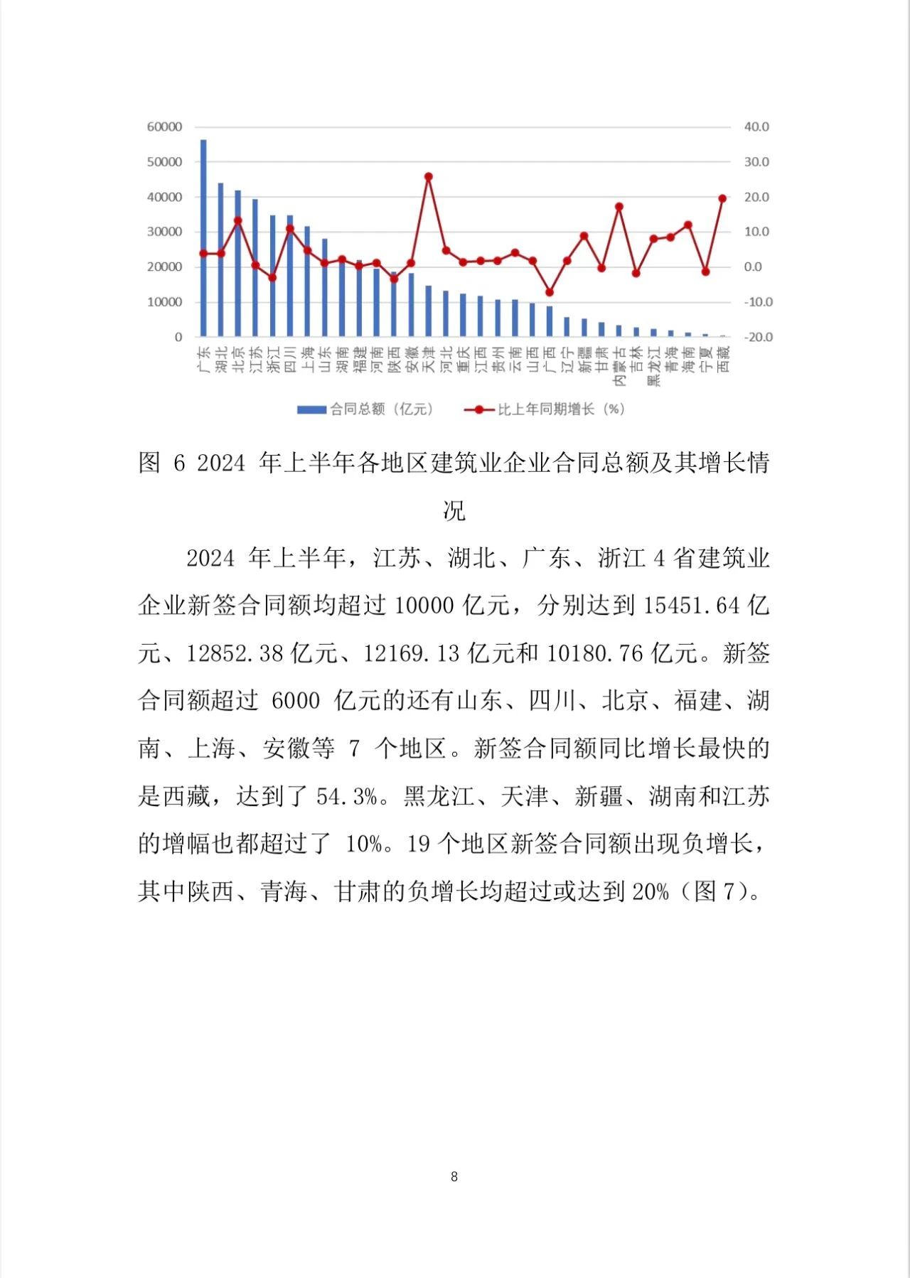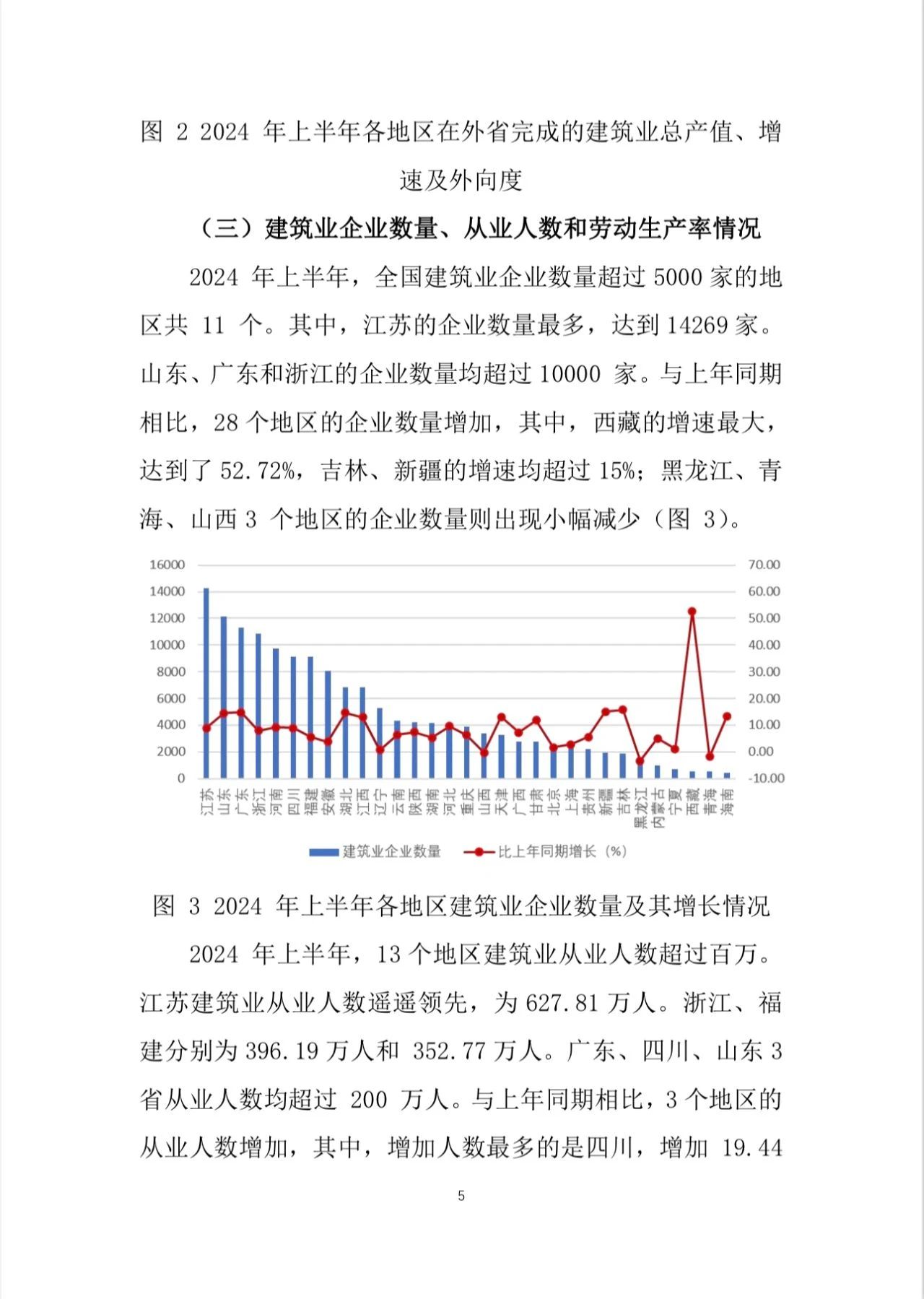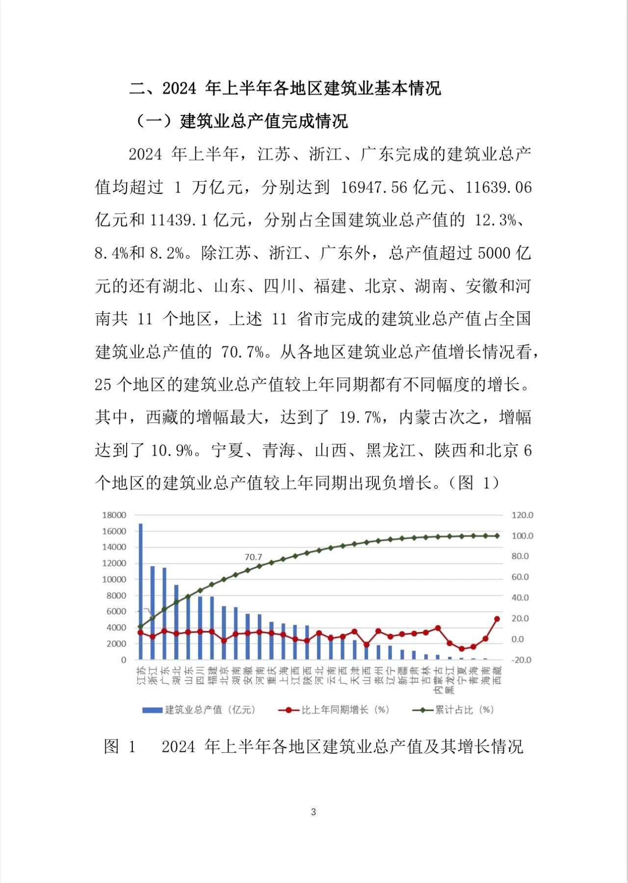 日前,中国建筑业协会发布《2024年上半年建筑业发展统计分析》。统计显示,2024年上半年我国国内生产总值616836亿元,比上年同期增长5.0%。上半年建筑业实现增加值37771亿元,比上年同期增长4.8%,增速低于国内生产总值增速0.2个百分点。建筑业增加值占国内生产总值的比重为6.12%;江苏、浙江、广东完成的建筑业总产值均超过1万亿元。