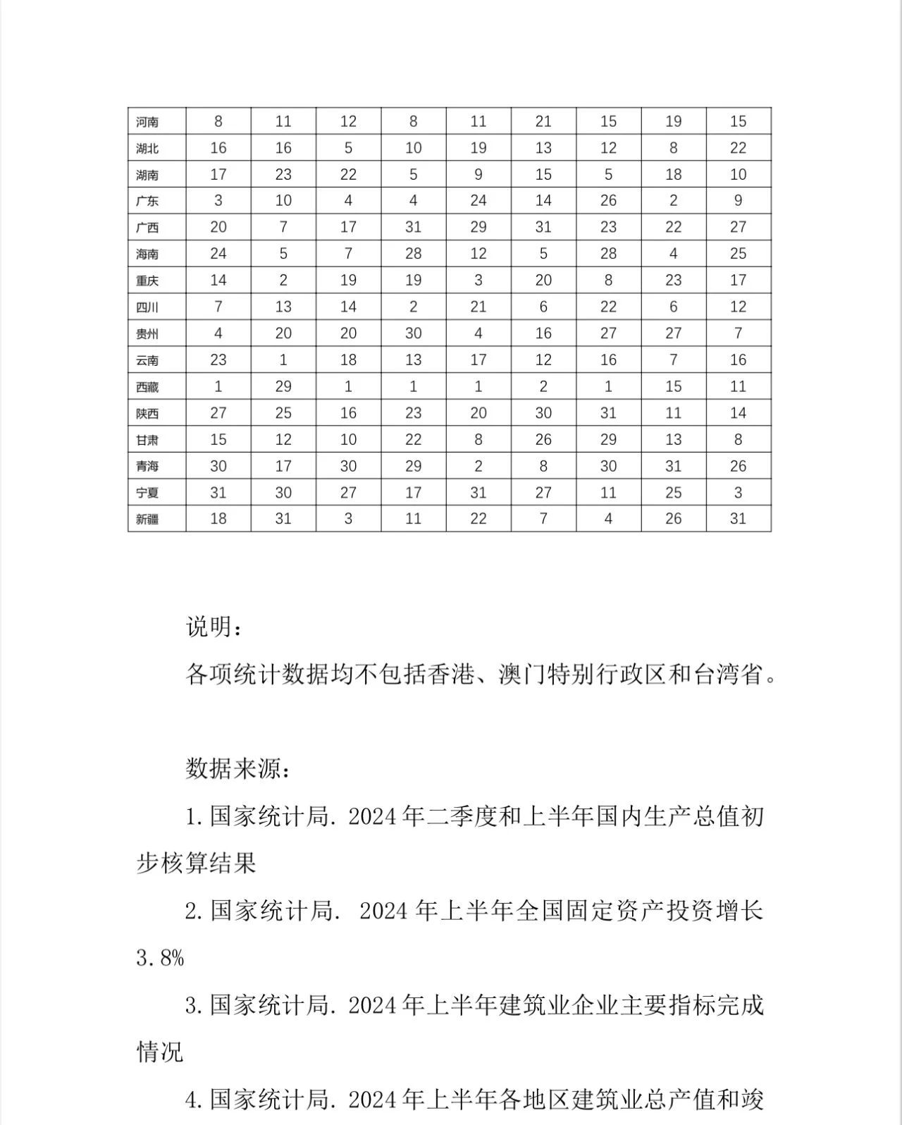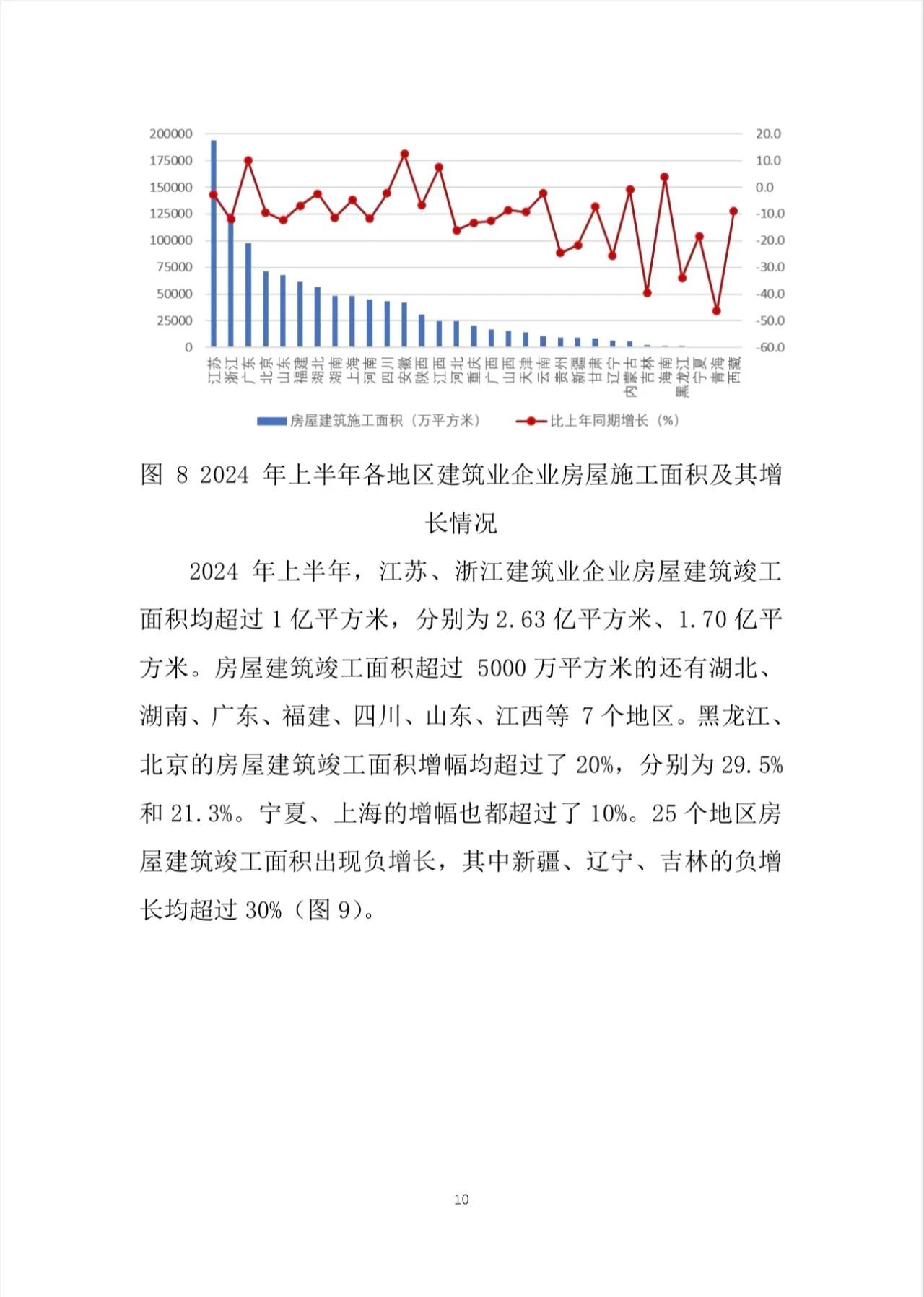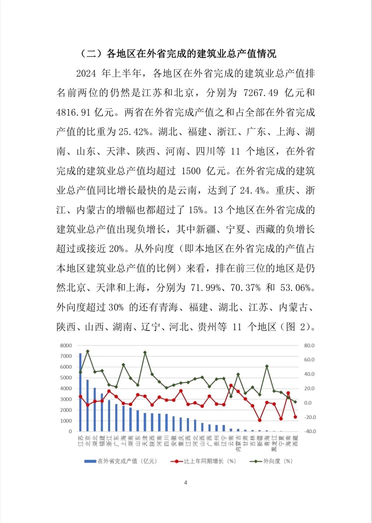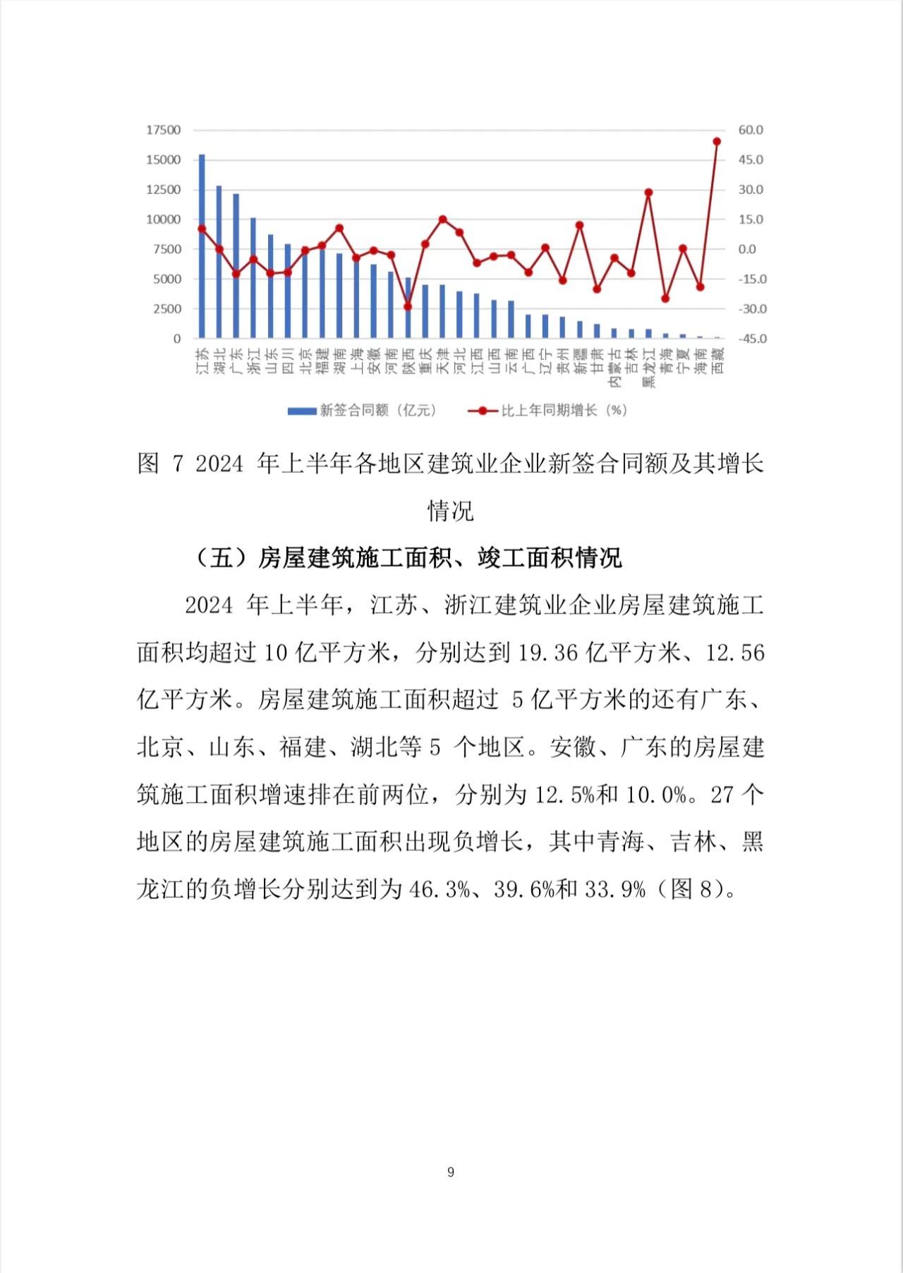 日前,中国建筑业协会发布《2024年上半年建筑业发展统计分析》。统计显示,2024年上半年我国国内生产总值616836亿元,比上年同期增长5.0%。上半年建筑业实现增加值37771亿元,比上年同期增长4.8%,增速低于国内生产总值增速0.2个百分点。建筑业增加值占国内生产总值的比重为6.12%;江苏、浙江、广东完成的建筑业总产值均超过1万亿元。