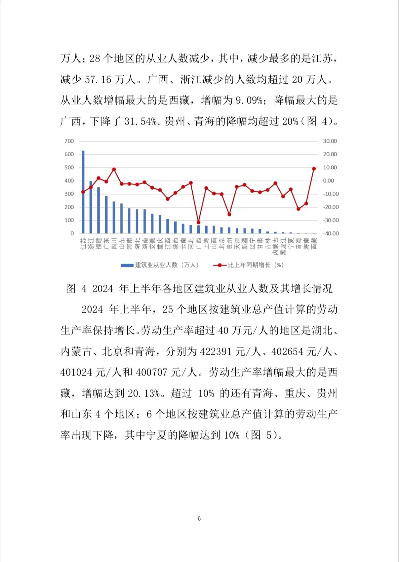 截至2024年6月底,全国有施工活动的建筑业企业151901个,同比增长8.7%;从业人数3820.74万人,同比降低4.9%。其中,国有及国有控股建筑业企业10050个,比上年同期增加1338个,占建筑业企业总数的6.62%。2024年上半年,按建筑业总产值计算的劳动生产率为294227元/人,同比增长4.05%。