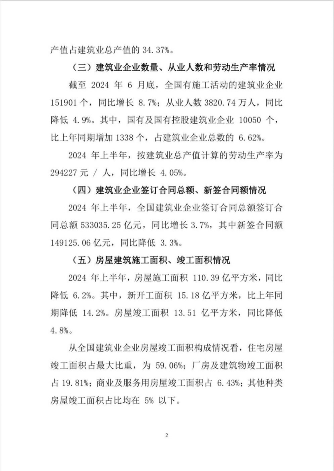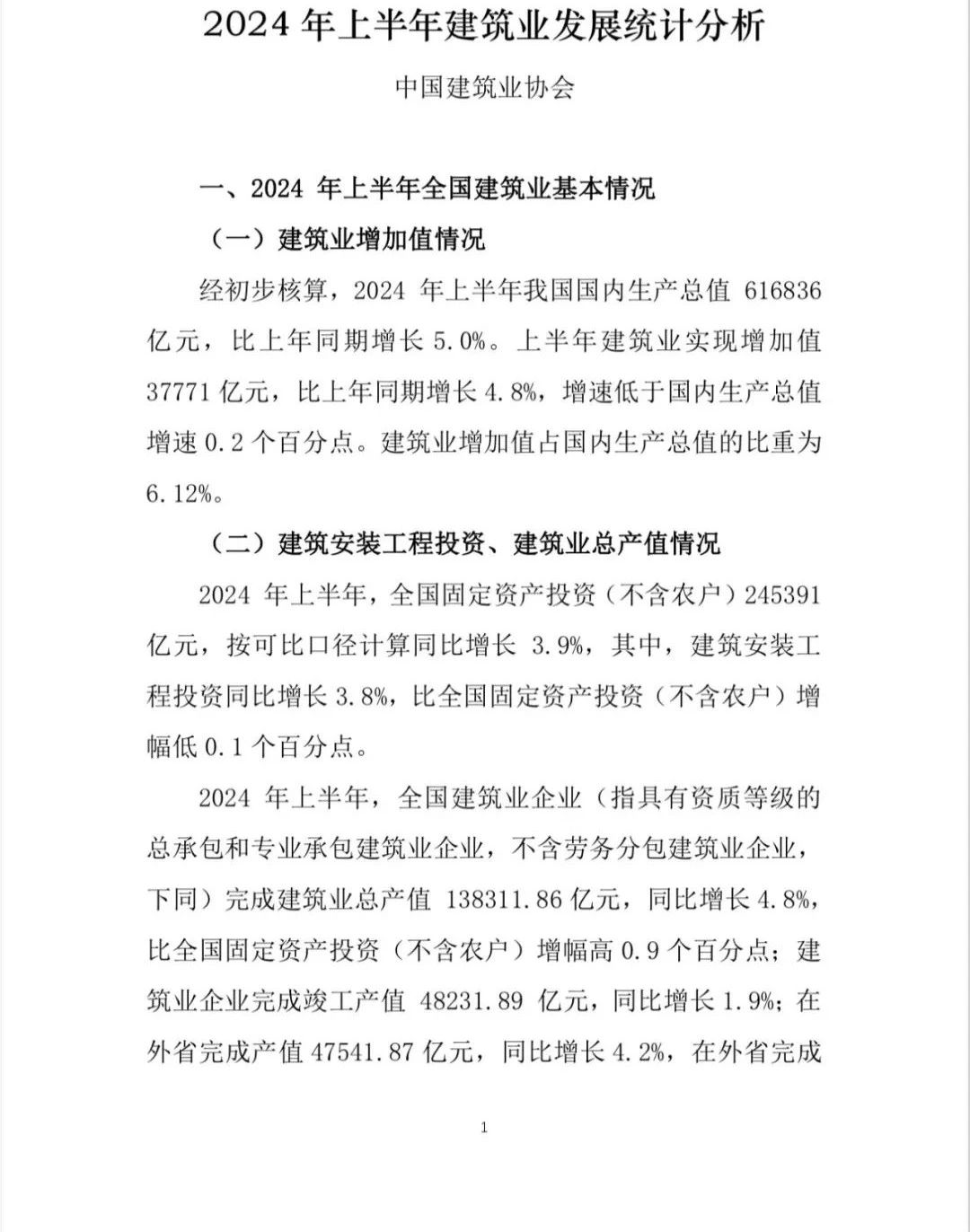 2024年上半年,全国建筑业企业(指具有资质等级的总承包和专业承包建筑业企业,不含劳务分包建筑业企业,下同)完成建筑业总产值138311.86亿元,同比增长4.8%,比全国固定资产投资(不含农户,下同)增幅高0.9个百分点;建筑业企业完成竣工产值48231.89亿元,同比增长1.9%;在外省完成产值47541.87亿元,同比增长4.2%,在外省完成产值占建筑业总产值的34.37%;全国固定资产投资245391亿元,按可比口径计算同比增长3.9%,其中,建筑安装工程投资同比增长3.8%,比全国固定资产投资增幅低0.1个百分点;全国建筑业企业签订合同总额533035.25亿元,同比增长3.7%,其中新签合同额149125.06亿元,同比降低3.3%;房屋施工面积110.39亿平方米,同比降低6.2%。其中,新开工面积15.18亿平方米,比上年同期降低14.2%。房屋竣工面积13.51亿平方米,同比降低4.8%。