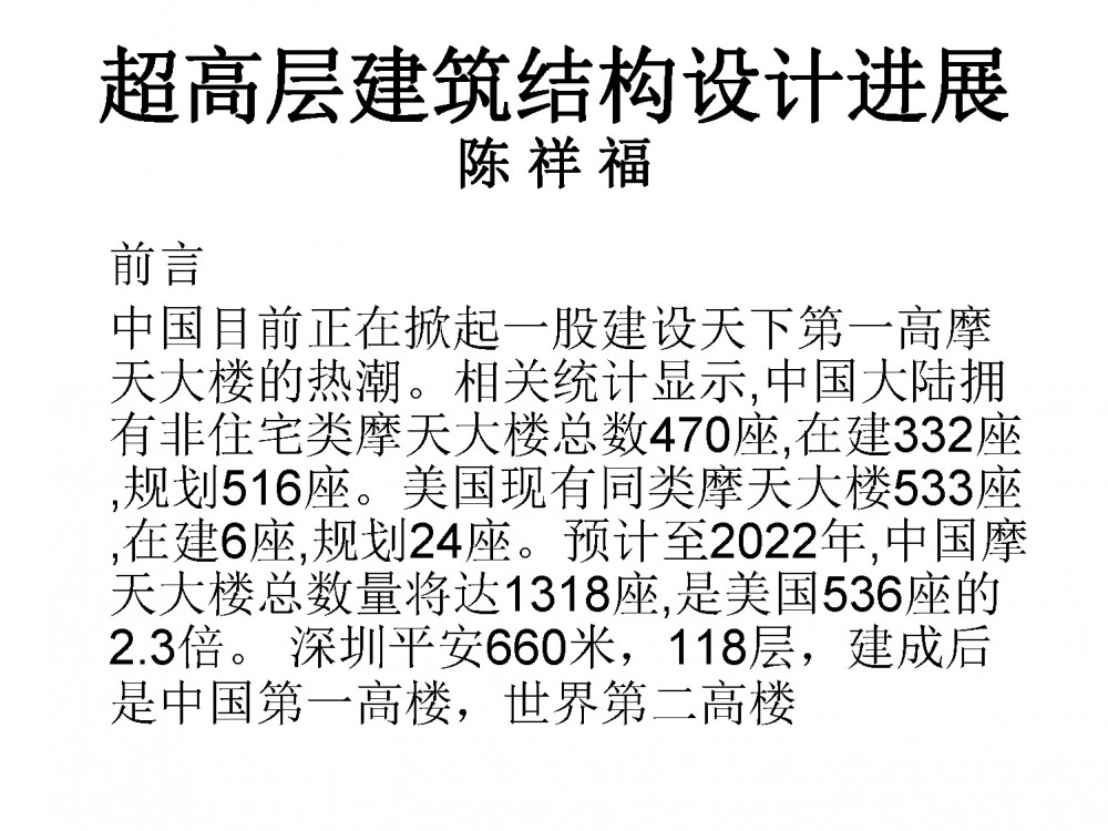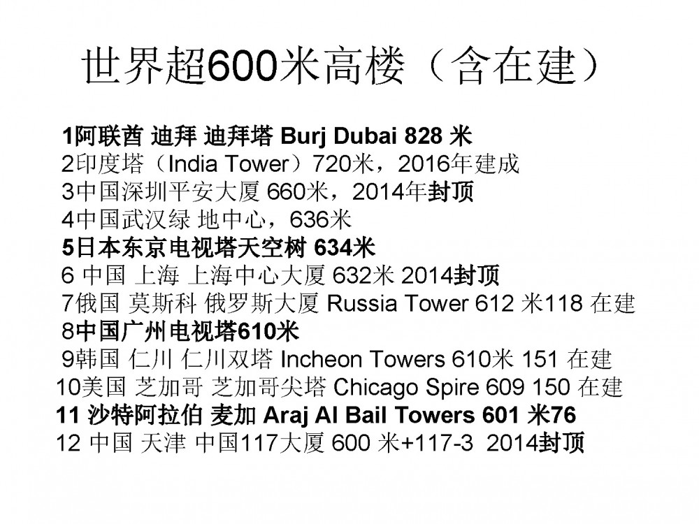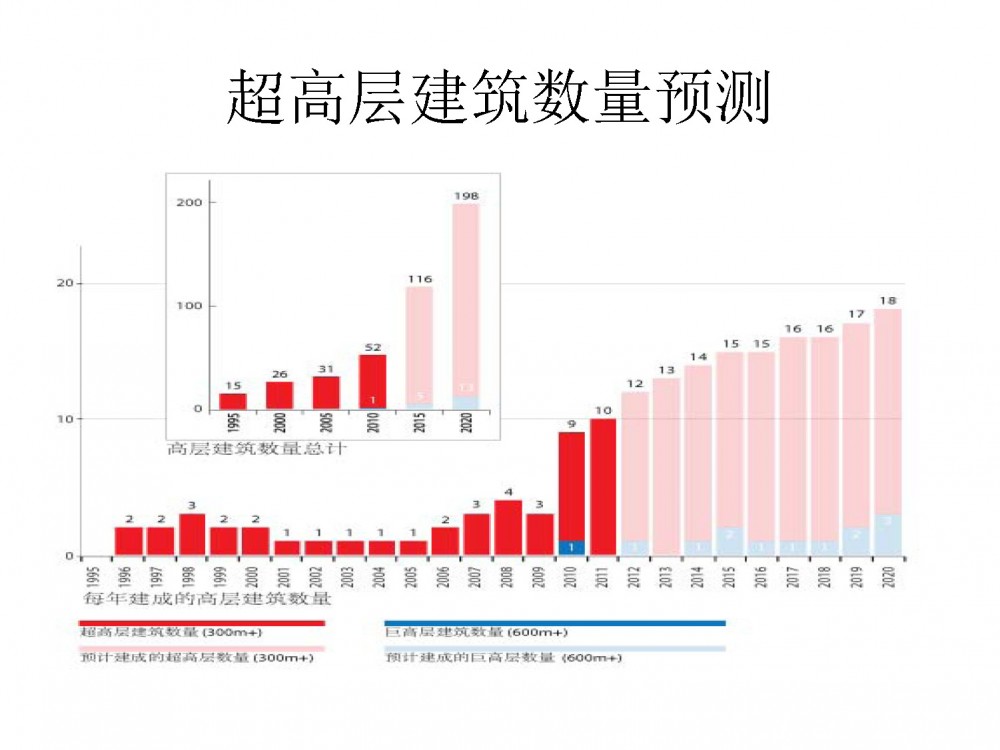 中国目前正在掀起一股建设天下第一高摩天大楼的热潮。相关统计显示,中国大陆拥有非住宅类摩天大楼总数470座,在建332座,规划516座。美国现有同类摩天大楼533座,在建6座,规划24座。预计至2022年,中国摩天大楼总数量将达1318座,是美国536座的2.3倍。