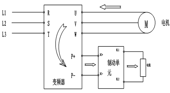 当停机或降速时,在变频器频率(箭头为电机发电状态时的电流方向)减小的瞬间,电机的同步转速随之下降,而由于机械惯性的原因,电机转子转速未变,当同步转速小于转子转速时,转子电流的相位几乎改变了180°,电机从电动状态变为发电状态。同时电机轴上的转矩变成了制动转矩,使电机的转速迅速下降,电机处于再生制动状态,电机再生的电能经变频器内二极管全部整流后反馈到直流母线电路。由于直流电路的电能无法通过整流桥回馈到电网,仅靠变频器本身的吸收,虽然其他部分能消耗一部分电能,但电容仍有短时间的电荷堆积,形成“泵升电压”,使直流母线电压升高。这时,制动单元开启工作,将负载拖动电机所产生的再生电能传导并通过发热方式消耗在制动电阻上,以提高变频器的制动能力,确保电机能在设置的时间内快速停车。电机的快速停车,可以有效的避免振动锤机械端的共振,达到保护变频器、电机及相关机械部件和机械设备的作用。