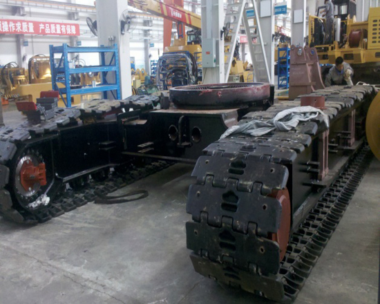 CHUY3600型履带式强夯机下车总成主要由H型梁和履带架总成组成。履带架总成由履带架、四轮一带和行走机构组成。每个履带架总成都带有独立的行走驱动装置,并通过驱动轮的传动来实现独立行走。除了定期更换齿轮油以外,履带架总成可以实现免维护。