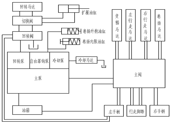 液压系统主要包括起升回路、变幅回路、回转回路、行走回路、下车油缸回路、回油冷却回路等,液压系统原理框图如图4.1所示。