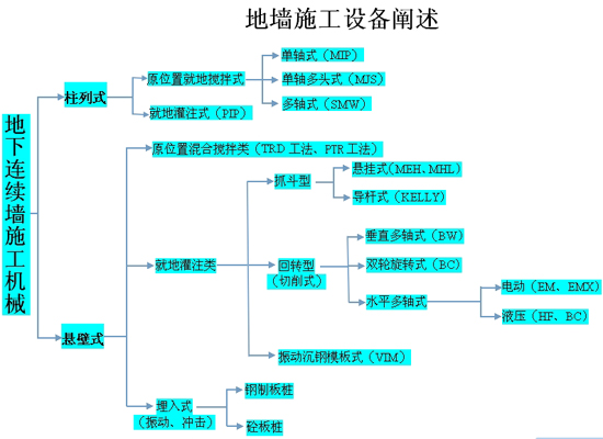 在施工过程中,与其配套施工机械设备必须不断改进创新和发展。地下连续墙之所以能得到广泛应用,与其专业施工设备是分不开的,以下介绍各种施工工法专业设备的性能和应用。地下连续墙设备分类如下: