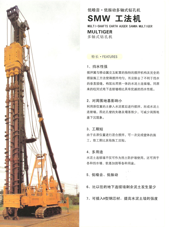 该工法设备利用长螺旋钻孔机进行就地灌注桩的重叠搭接施工。对于单轴式长螺旋钻机,由于其回转轴刚性不足,随着施工深度的加大,桩与桩之间不能很好的重叠搭接咬合,特别是对于以防水为目的的防渗墙效果就很差。由于这个原因,长螺旋钻孔机采用了双轴或双重钻孔的形式,用以提高施工搭接咬合和垂直精度。近年来为了解决上述问题,已经开发出了利用多轴(一般为三轴)螺旋钻孔机(SMW工法)进行就地灌注桩的重叠搭接施工。该工法属于机械强制搅拌式,用多轴长螺旋钻孔机在土层中钻孔,在钻孔的同时通过钻杆从钻头端部注入水泥浆和高压空气,在原位置上建成一段水泥土墙,然后再进行第二段墙施工,使相邻的水泥土墙彼此有重合段,连续施工形成墙体用于挡土止水。SMW工法的不足之处,在于设备高度较高,所以重心位置比较高,在施工中必需十分注意机械的稳定性。为了解决此问题,目前已开发出可在施工中接长钻杆的低重心机型。另外,该工法在遇到超深度和硬岩基础时,会出现重叠搭接咬合消失和无法钻入孔的情况,因此在施工中,必须采取随时确认桩孔质量的位置精度等方法。