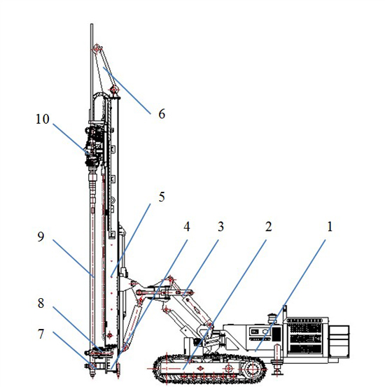6—上桅杆;7—静钳装置;8—动钳装置;9—钻具;10—动力头