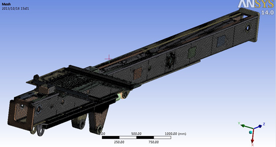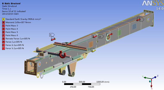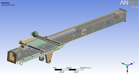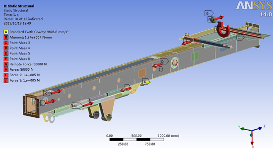 中桅杆总成主要由中桅杆箱梁、进给油缸、动滑轮组、定滑轮、板链组成。从结构和受力来看,较大应力容易集中在进给油缸安装孔、静滑轮安装孔、板链固定端、动力头小车滑道等地方。对中桅杆进行有限元分析有利于研究“油缸-链条”倍速进给机构的设计合理性,同时也有利于了解桅杆在极限工况下的应力应变情况,有助于后期的优化改进。