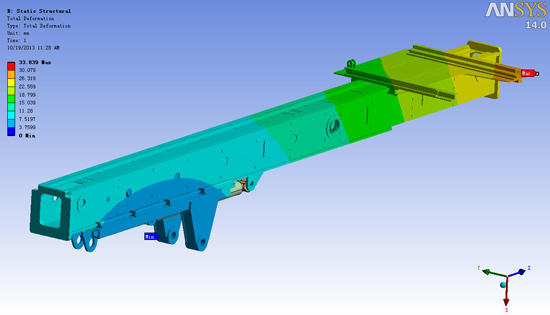 加压钻进工况变形分布云图如图11所示。最大变形为33.84mm,位于动力头小车滑道末端。中桅杆全长约6700mm,故最大变形量约为5‰,非常微小,满足刚度要求。